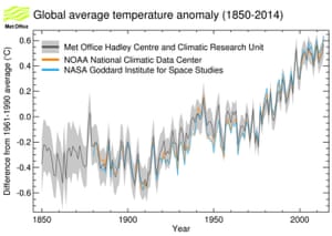 FacebookTwitterPinterest Chart showing average global temperatures from 1850 to 2015 according to three major datasets Photograph: Met Office, UK