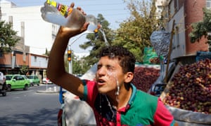 An Iranian street vendor pours water on his face to cool off during a heatwave in Tehran, Iran, 02 August 2015. Photograph: Abedin Taherkenareh/EPA